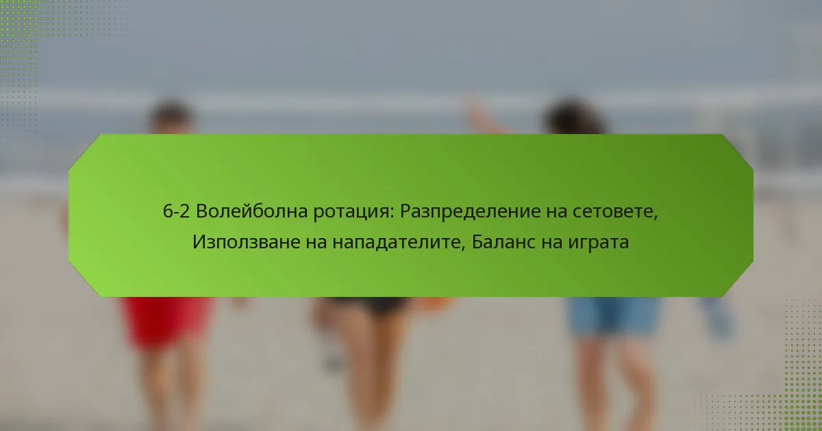 Ротацията 6-2 във волейбола е система, която използва шестима играчи в предния ред и двама разпределители, позволявайки балансирана офанзивна стратегия. Тази ротация подобрява способността на отбора да атакува, като същевременно поддържа дефанзивни възможности, което я прави популярен избор в конкурентната игра.